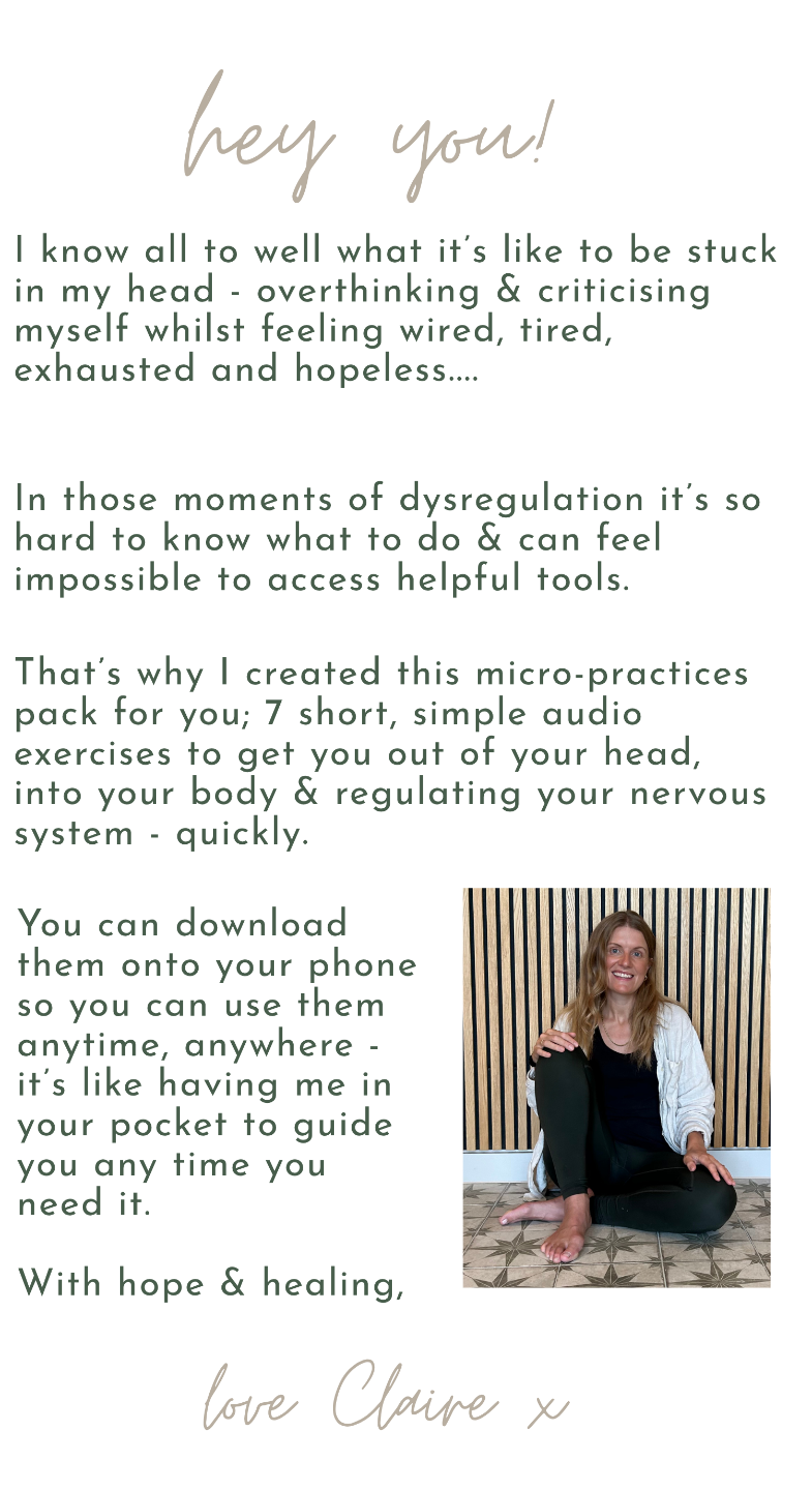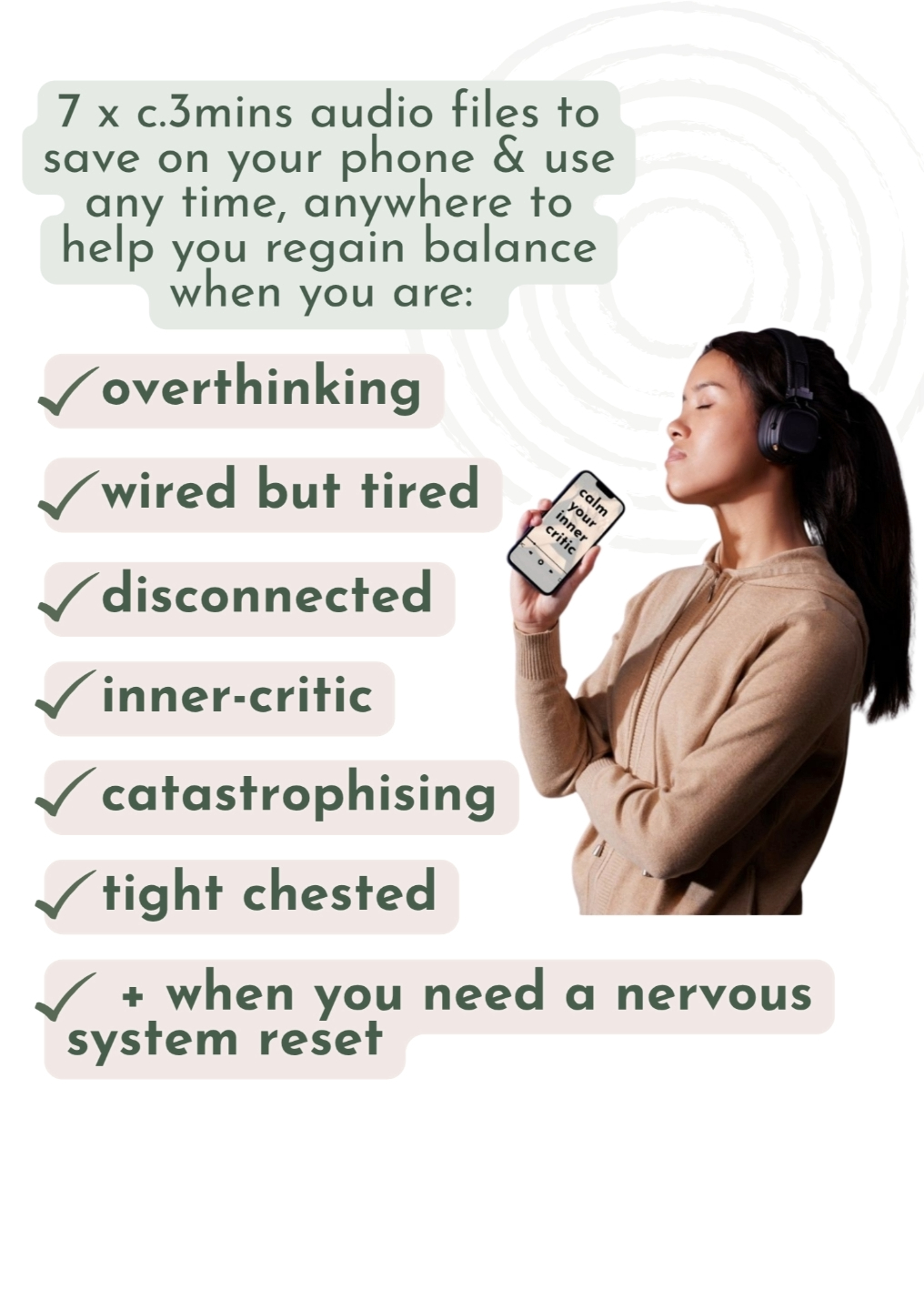 A collection of 7 guided audio practices (3–5 minutes each) designed for 7 of those moments you need support most. Quick, practical, body-first tools to help you shift out of survival mode and back into steadiness.